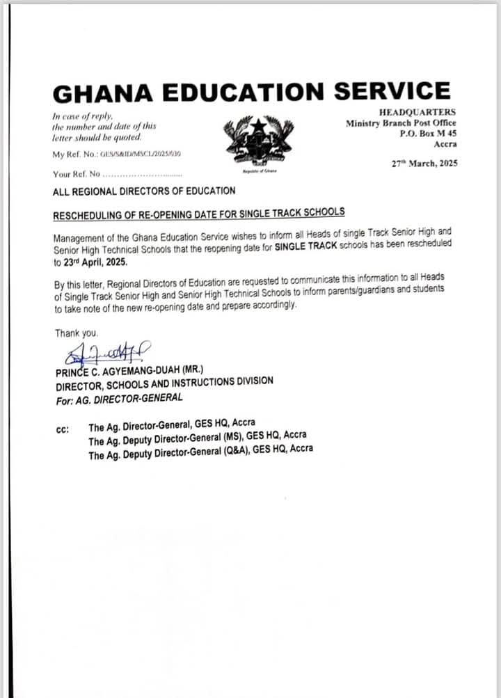 The Ghana Education Service (GES) has rescheduled the reopening date for Senior High Schools who are rolling out a single track under the Free SHS programme across the country to April 23.