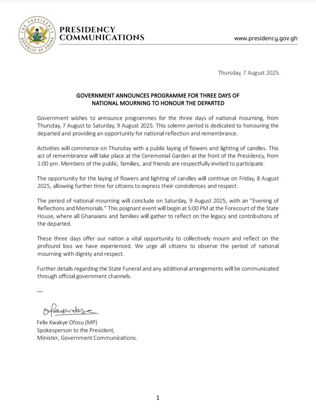 The programme continues on August 8 with a wreath-laying and candle-lighting ceremony, giving the wider public an opportunity to honour the late officials. The mourning period will conclude on Saturday, August 9, with an Evening of Reflections and Memorials at the Forecourt of the State House, starting at 5:00 p.m.