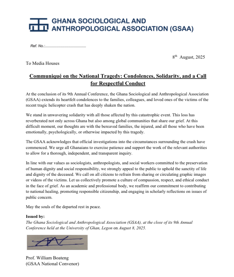 The Ghana Sociological and Anthropological Association (GSAA) has expressed deep sorrow over the recent helicopter crash on Wednesday, 6th August 2025, which claimed eight lives and left the nation in mourning.