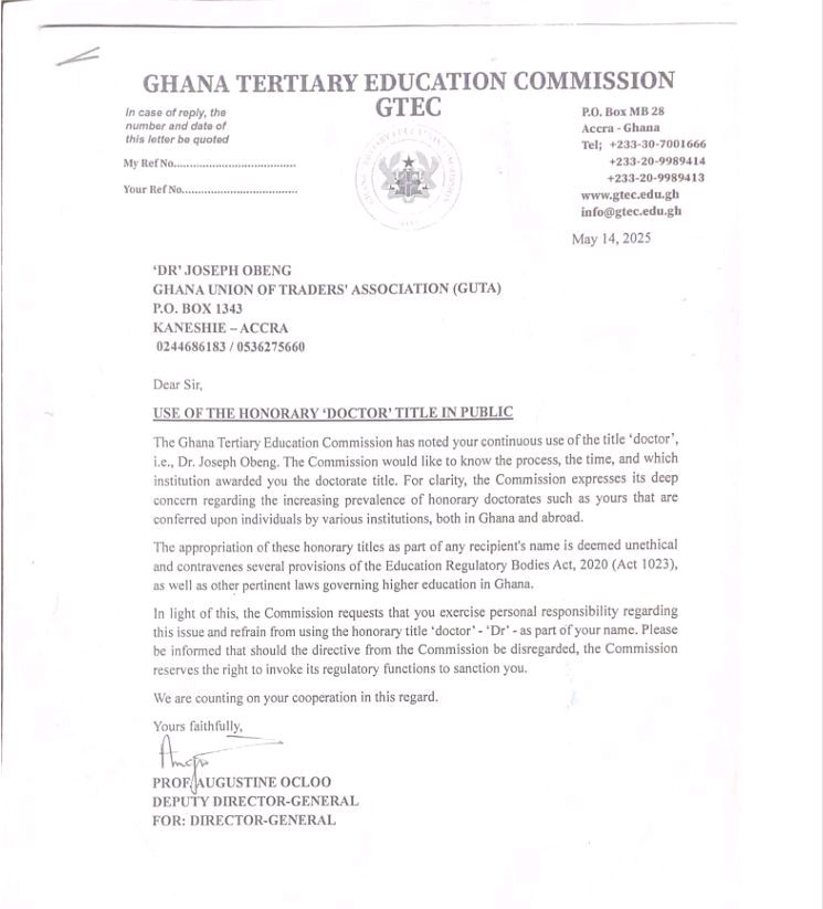 The foremost regulator of the country’s tertiary education space, Ghana Tertiary Education Commission has cautioned the President of the Ghana Union of Traders’ Association (GUTA), Joseph Obeng over his repeated use of his ‘Honorary’ Doctorate title in his dealings.
