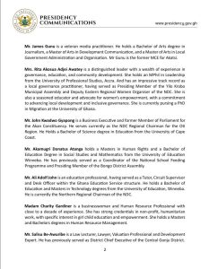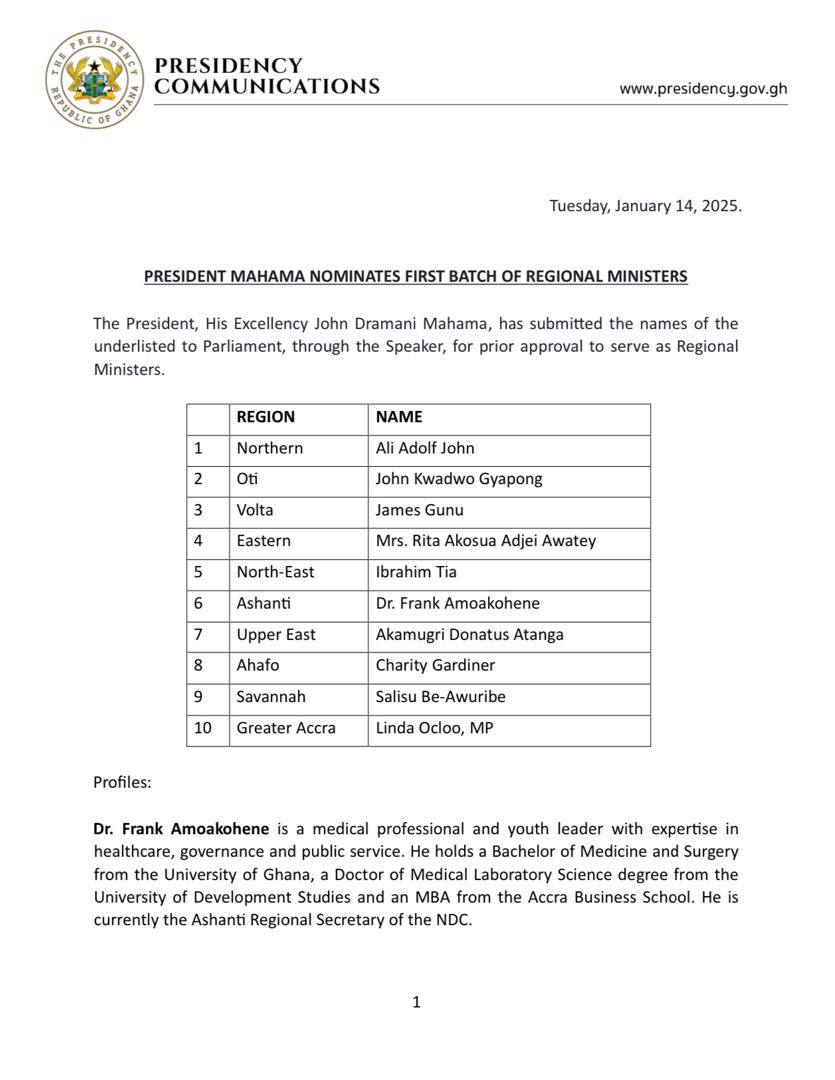 The latest document lists ten nominees designated to lead various regions in Ghana, accompanied by a formal request for parliamentary approval in line with constitutional provisions.