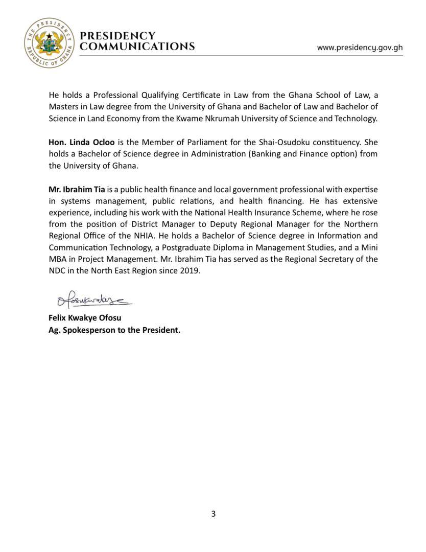 The letter to the Speaker of Parliament details and portfolios the President’s nominees for these positions.