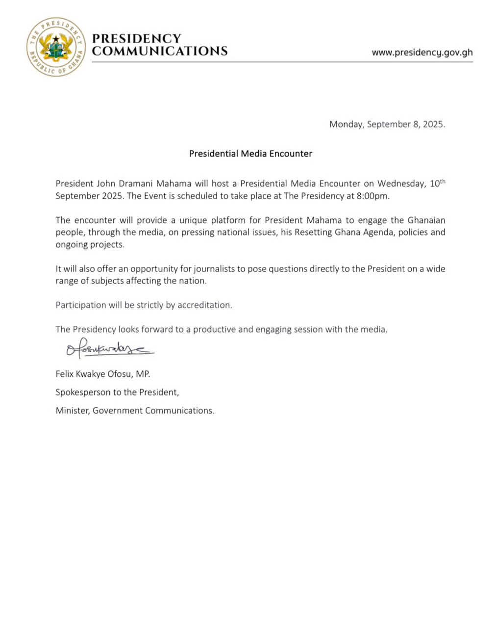 “The Presidency will play host to media houses in the country for an engagement scheduled for Wednesday, September 10, at 8 p.m. to address pressing issues across various sectors in the past few months of the new government. It falls in line with the core aim of the Mahama-led government to be accountable in all forms to the Ghanaian populace for the massive endorsement given the NDC by voters on December 7 last year,” the statement said.