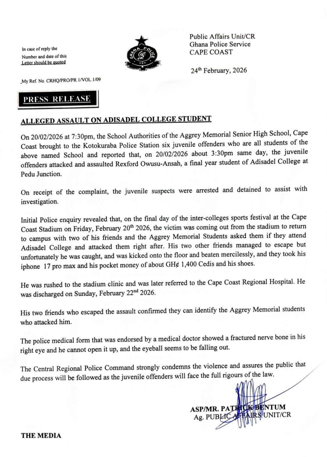In a press release issued by the Public Affairs Unit of the Central Regional Police Command on February 24, 2026, the incident reportedly occurred on Friday, February 20, 2026, following the inter-college sports festival held at the Cape Coast Stadium. The victim, Rexford Owusu-Ansah, was allegedly confronted and assaulted by some Aggrey Memorial students.