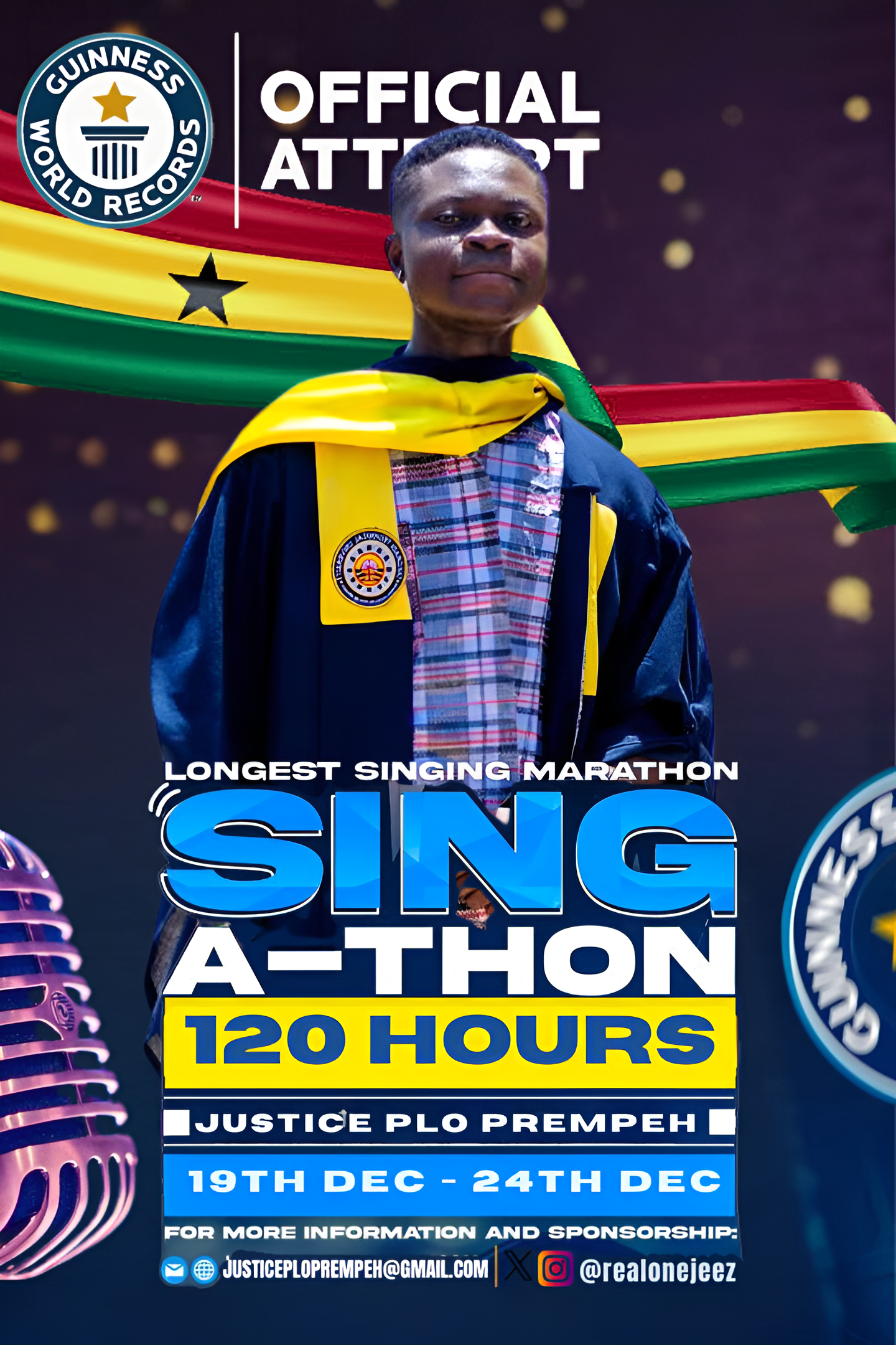 A young Ghanaian graduate from Takoradi Technical University (TTU), Justice Plo Prempeh, is preparing to attempt a Guinness World Record for the longest individual singing marathon this December.
